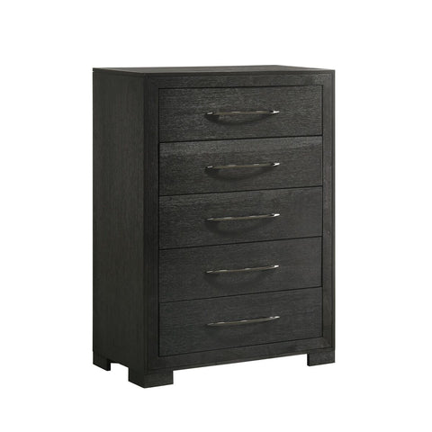 Satisfying your taste for tradition, this chest of drawers sports serene sophistication. Forever classic design details - inlaid panels, silvertone patina hardware and bun feet are so easy to love. Burnished light gray finish elevates the look with modern sensibility. Five roomy drawers keep your wardrobe organized in style.