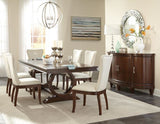 The modern traditional styling of the Oratorio Collection paired with two distinct table offerings allow the creation of your dream dining room. Cherry finish over cherry veneer lends a classic look to the unique design of the rectangular pedestal table and round table’s pedestal base. The ring shape of the rectangular table’s base provides distinct character while the substantial profile of the round table’s pedestal base lends sturdy yet stylish support. The side chairs that flank the rectangular table feature neutral toned fabric and nail head complementing the sophisticated design. Barrel back contoured swivel chairs surround the round table lending motion and unique design to the collection. An available server provides ample storage space for your tabletop accessories.