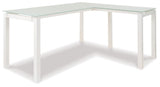 This L-desk delivers the functionality you crave with the modern style that suits your taste. Frosted glass appears to float over the streamlined metal base. The desk's L-shape design sets up two different ways, enabling left-handed and right-handed users to maximize their workspace.