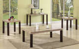 This set of a coffee table and two end tables boasts a stylish caramel top and elegant expresso legs. With this set, you can add a touch of sophistication to your living space. Crafted with high-quality materials, this furniture set is both durable and visually appealing, making it a valuable addition to any home decor.