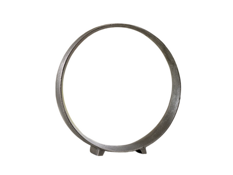 This sculpture brings contemporary art full circle. Interlocking metal rings in a black finish add an art gallery touch for a console table, bookshelf or mantel.