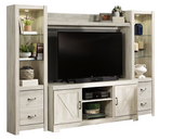 Wispy white finish over replicated Oak grain with authentic touch. Handles in a brushed nickel colored finish with black hang up. The W331-68 is compatible with the W100-02101 LED fireplace insert. Entertainment piers feature open glass shelving for display with display light and doors for storage. Doors on the entertainment piers and TV stand have adjustable shelves. TV stand features crossbuck details on the doors.