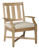 An effortlessly elegant choice in outdoor furniture, this outdoor dining arm chair marries sturdiness and style in such a delightful way. For that much more weather protection, the chair's eucalyptus wood frame with tapered touches and slat styling is treated to a 5-step finishing process. Sumptuously soft yet remarkably durable, the included seat cushion is wrapped in a high-performing, low-maintenance Nuvella® fabric you’re sure to love.