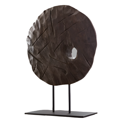 Elegantly adorn your bookshelf, mantel or dining table with this sculpture. Wood in an antiqued brown finish is brimming with natural beauty and adds warmth to your space. A sleekly styled black metal base grounds the piece.