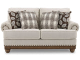 True classic character comes to life in this loveseat. Set back pleated rolled arms and warm brown exposed frame with bun feet are beautifully traditional. Lovely detailing carries itself through the herringbone weave in the soft upholstery. Seat cushions reverse to maintain durable comfort. Vintage-inspired jumbo nailhead trim graces the design. Plaid and botanical pillows in dark brown are a timeless touch.