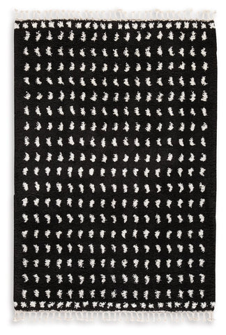 Sink your feet into this modern area rug. Offering a luxurious shag with a woven dot design in black and white, it adds sophistication without sacrificing comfort or durability. A braided tassel edge completes the design of this family-friendly accent rug.
