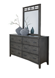 Cool and clean, yet warm and inviting. This dresser with mirror has so many standout qualities, making it an inspired choice for your dream destination. A prime example of “casual contemporary” style at its very best, these designer pieces are dressed to impress with an embossed wood grain texture. Spacious inset drawers with fully finished interiors offer ample storage for your wardrobe and spare bed linens. And the medium gray-brown finish with a blackened wood grain is wonderfully easy on the eyes.