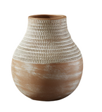 Casual, earthy design comes to life with this terra cotta vase. A distressed white patina is the perfect finish for this piece, giving it an understated presence to stand alone or in pairs on a shelf or display space.
