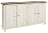 Whether your style is cottage chic, boho inspired or uniquely eclectic, this accent cabinet is sure to look right at home. Standout elements include raised panel door fronts that are a work of art. Wonderfully timeworn in antique white, this 4-door cabinet is topped with a warm brown finish for two-tone interest. Two adjustable shelves add to its practicality.