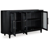 Inspired by art deco design, this dining server makes a lasting impression in a simply stunning way. Its magnificent rounded silhouette is enhanced with a rich layered black finish on the textured wood grain surface. Complete with glass cabinet doors, interior shelving and tapered legs, it’s the contemporary statement piece you’ve been seeking to elevate late-night dinners and full-on family feasts.