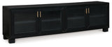 If you are a lover of simplicity, this TV stand is the perfect choice. With a black finish, a casual contemporary design and spacious storage cabinets, it provides functional style wherever it’s displayed. And this large media cabinet accommodates flat-screen TVs up to 85 inches.